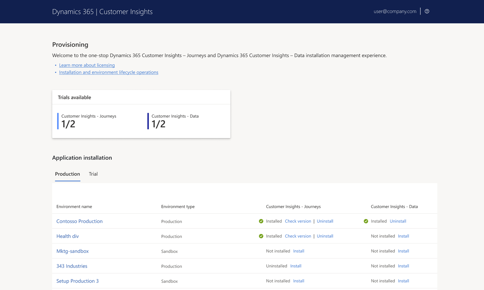 Wszystkie środowiska dataverse dla obszaru geograficznego wybranego w centrum administracyjnym platformy Power Platform są wymienione w obszarze zarządzania instalacją według typu (produkcja lub wersja próbna). Możesz zobaczyć, gdzie są zainstalowane aplikacje Customer Insights – Journeys i Customer Insights – Data, i podjąć akcje instalowania i odinstalowywania.