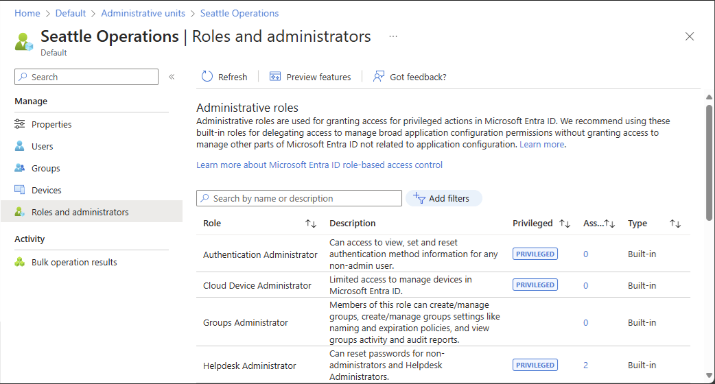 Nie zobaczysz tutaj całej listy wbudowanych ani niestandardowych ról Microsoft Entra. Jest to oczekiwane. Przedstawiamy role, które mają uprawnienia związane z obiektami obsługiwanymi w jednostce administracyjnej. Aby wyświetlić listę obiektów obsługiwanych w ramach jednostki administracyjnej, zobacz Jednostki administracyjne w identyfikatorze Entra firmy Microsoft.