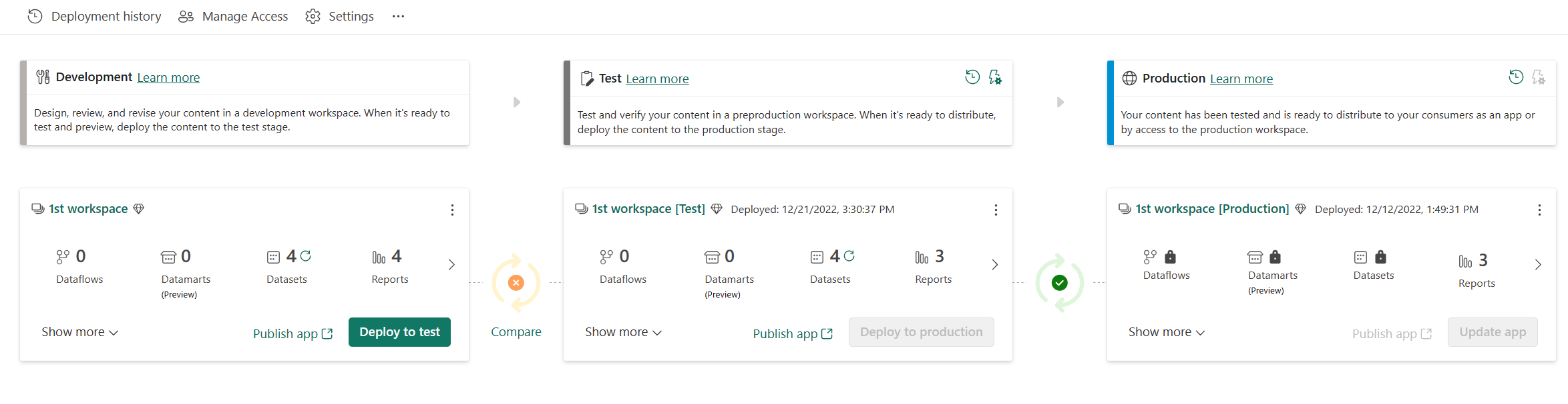 Aby uzyskać najbardziej wydajne środowisko zarządzania cyklem życia w usłudze Fabric, połącz obszar roboczy dewelopera z usługą Git i wdróż go z połączonego obszaru roboczego przy użyciu potoków wdrażania.