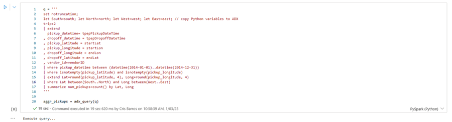 Pozostała część tego przepływu pracy używa biblioteki Kqlmagic do wykonywania zapytań i wizualizowania danych w bazie danych KQL.