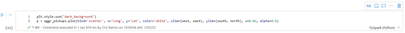 Uruchom pozostałe komórki sekwencyjnie, aby utworzyć mapę cieplną pickupów taksówek w Nowym Jorku. Aby uzyskać więcej informacji na temat biblioteki Kqlmagic, zobacz Use a Jupyter Notebook and Kqlmagic extension to analyze data (Używanie notesu Jupyter Notebook i rozszerzenia Kqlmagic do analizowania danych)