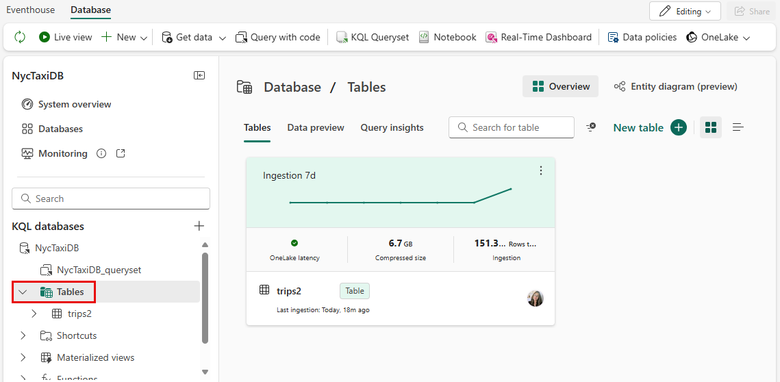 Odśwież zestaw zapytań i wybierz pozycję Tabele , aby wyświetlić przegląd nowo utworzonej tabeli o nazwie trips2. W tym miejscu możesz rozwinąć schemat tabeli, wyświetlić podgląd danych i wyświetlić szczegółowe informacje o zapytaniach.