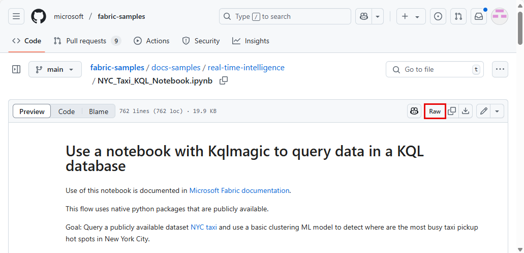 Otwórz repozytorium Fabric samples na GitHub i pobierz NYC Taxi KQL Notebook.