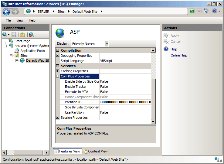In the ASP pane, expand the Com Plus Properties section and configure your desired settings.