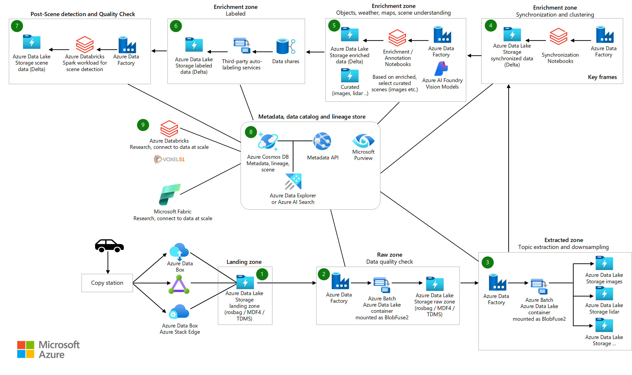 A Data Factory pipeline runs to enrich the data. Examples of enhancements include telemetry, vehicle logger data, and other data, such as weather, map, object data or advanced data to identify edge cases/behavior of other vehicles such as using vision language models in Azure AI Foundry like GPT-4o or fine-tuned smaller models from Microsoft's Phi model family. Enriched data helps to provide data scientists with insights that they can use in algorithm development and data curation for labeling, for example. The generated data is kept in Apache Parquet/Delta files that are compatible with the synchronized data. Metadata about the enriched data is stored in a metadata store in Azure Cosmos DB.