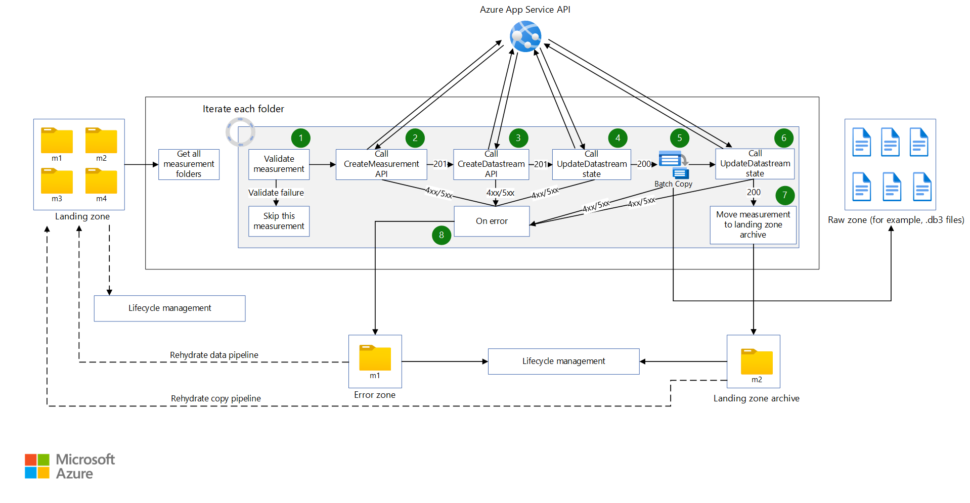 Start Copy. If the call succeeds, the copy activity copies measurement files to the data stream location. If the call fails, the measurement is moved to the on-error activity.A Data Factory pipeline invokes Batch to copy the measurement files from the Landing storage account to the Raw storage account. A copy module of an orchestrator app creates a job with the following tasks for each measurement: