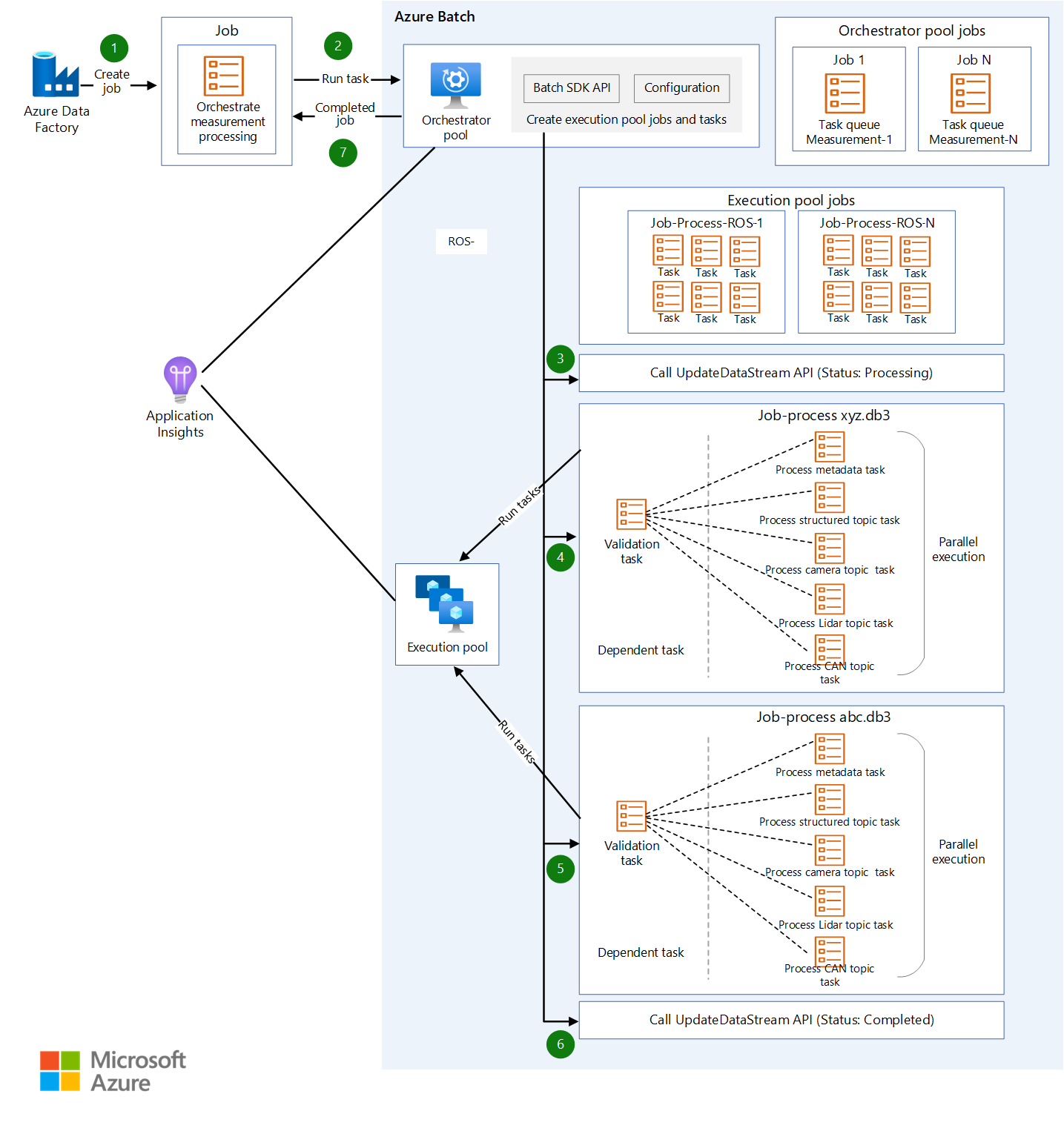 Task Purpose Note Validation Validates that data can be extracted from the measurement file. All other tasks depend on this task. Process metadata Derives metadata from the measurement file and enriches the file's metadata by using an API to update the file's metadata. Process StructuredTopicsExtracts structured data from a given measurement file. The list of topics to extract structured data from is passed as a configuration object. Process CameraTopicsExtracts image data from a given measurement file. The list of topics to extract images from is passed as a configuration object. Process LidarTopicsExtracts lidar data from a given measurement file. The list of topics to extract lidar data from is passed as a configuration object. Process CANTopicsExtracts controller area network (CAN) data from a given measurement file. The list of topics to extract data from is passed as a configuration object. The orchestrator pool monitors the progress of each task. After all the jobs finish for all measurement files, the pool invokes an API to update the data stream and set its status to