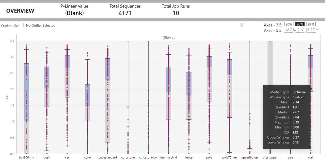 Use a DirectQuery connector in Azure Data Explorer to directly visualize and analyze results, such as distance-to-objects metrics, in a Power BI report or dashboard. Here's an example of how a report might display the results from a resimulation or recompute run: