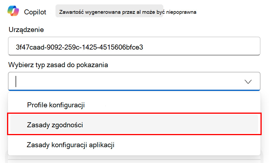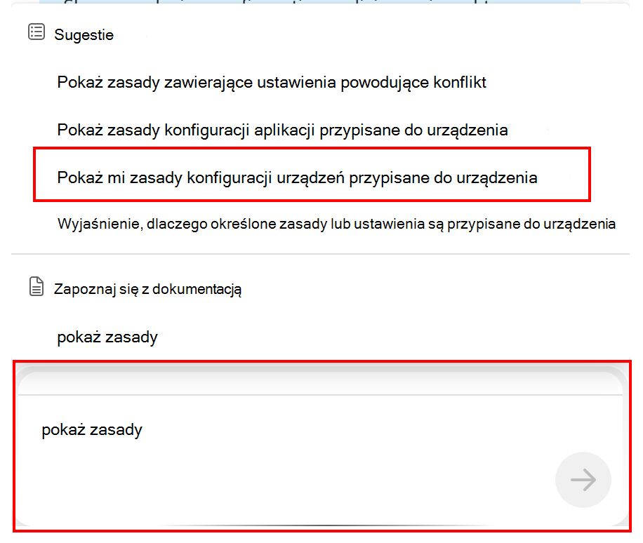 W centrum administracyjnym przejdź do pozycji Urządzenia>Wszystkie urządzenia i wybierz dowolne urządzenie. W sesji Copilot Chat wprowadź show policies i wybierz zasady konfiguracji urządzenia show me przypisane do monitu o urządzenie.