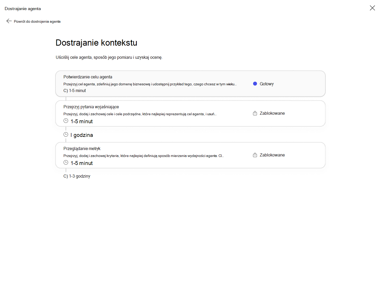 Dostrajanie kontekstu definiuje cele i kryteria powodzenia agenta, określając podstawowe zadanie, domenę i reprezentatywne przykłady. Wymagania dotyczące kontekstu różnią się w zależności od szablonu. Na przykład szablony do pisania dokumentów korzystają z przykładów typów dokumentów, które agent powinien utworzyć, szablony podsumowania dokumentów wymagają danych wejściowych, takich jak przeznaczenie, odbiorcy, długość, ton i obszar koncentracji uwagi, a szablony odpowiedzi ekspertów polegają na przykładowych plikach w celu generowania pytań i odpowiedzi ewaluacyjnych. W oparciu o te dane wejściowe system proponuje podgole i rubryki ewaluacyjne, które ustanawiają wymierny punkt odniesienia do oceny wydajności agenta.
