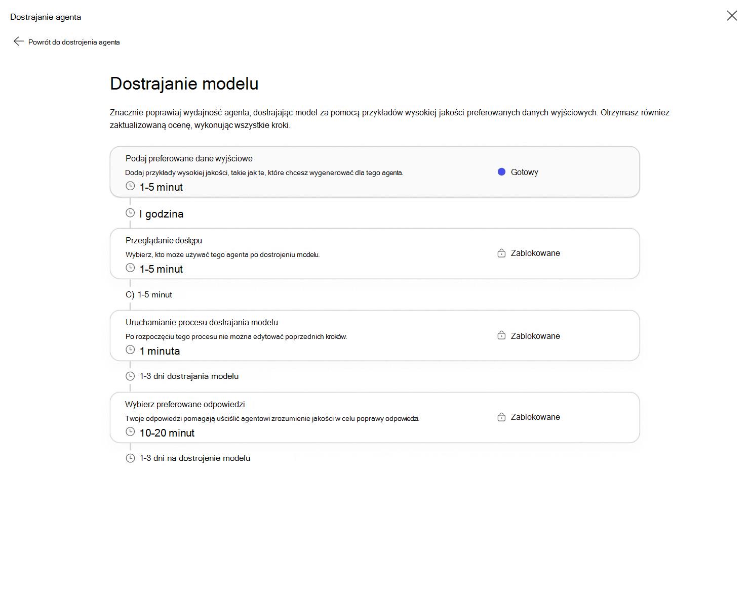 Dostrajanie modelu koncentruje się na poprawie rozumowania i jakości danych wyjściowych dzięki nadzorowanym dostrajaniu i wzmacnianiu technik uczenia. Przykłady wysokiej jakości z danych organizacji są używane jako dane wejściowe do trenowania, a rubryki ewaluacyjne są zgodne z oczekiwaniami organizacji. W trakcie tego procesu można stosować kontrolki dostępu, uprawnienia do plików i etykiety poufności. Dostrajanie modelu jest uruchamiane asynchronicznie, co pozwala użytkownikom na dalsze korzystanie z istniejącego agenta podczas dostrajania. Po zakończeniu dostrajania wyniki oceny określają, czy zaktualizowany model jest gotowy do opublikowania.