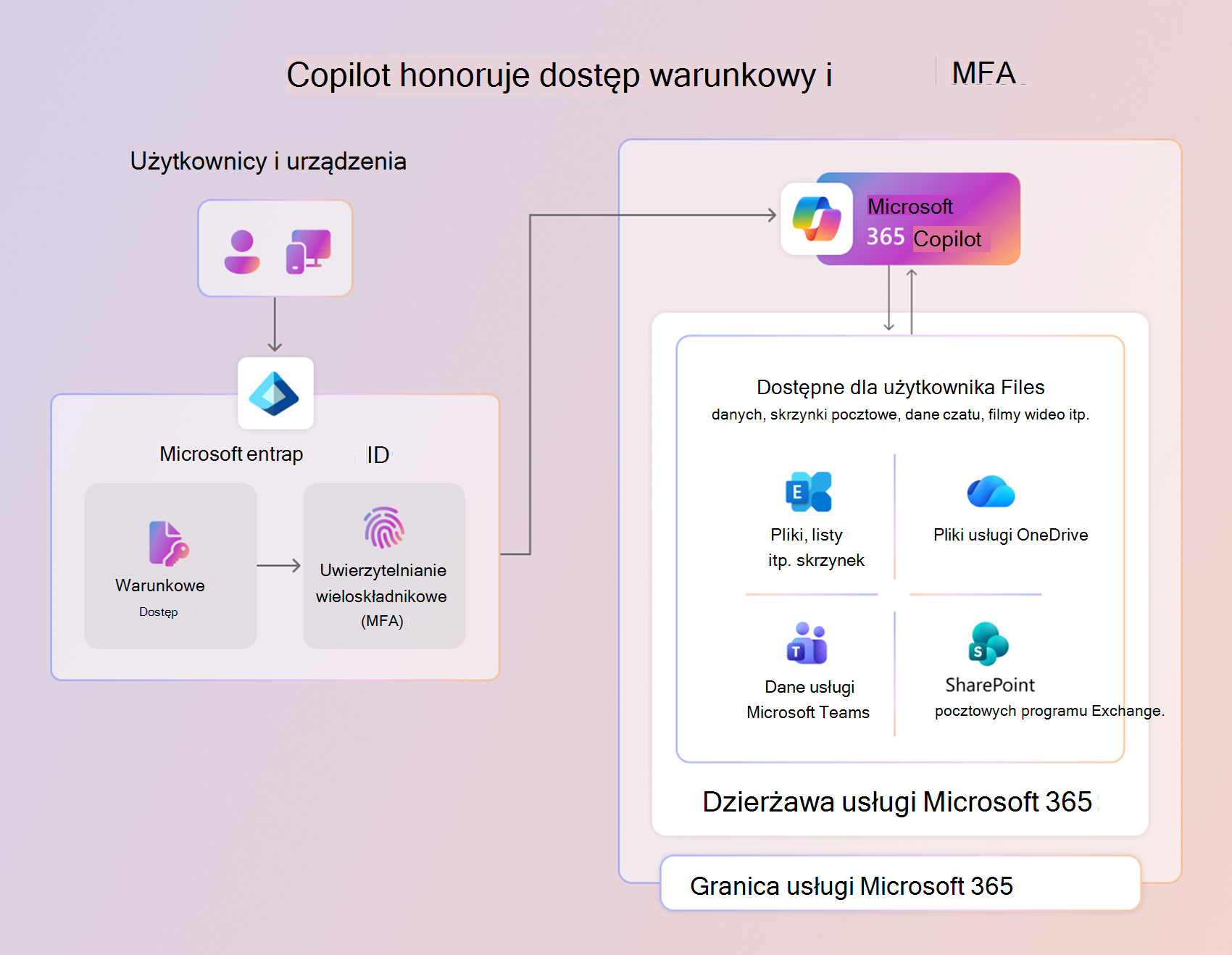 Copilot honoruje zasady dostępu warunkowego i uwierzytelnianie wieloskładnikowe (MFA).
