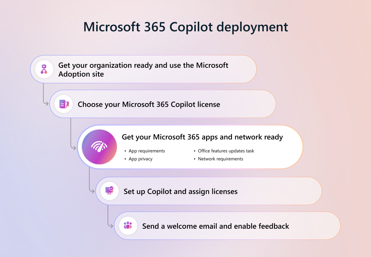 W ramach wdrażania Microsoft 365 Copilot upewnij się, że skonfigurowano wymagania dotyczące aplikacji i sieci, które umożliwiają integrację aplikacji.