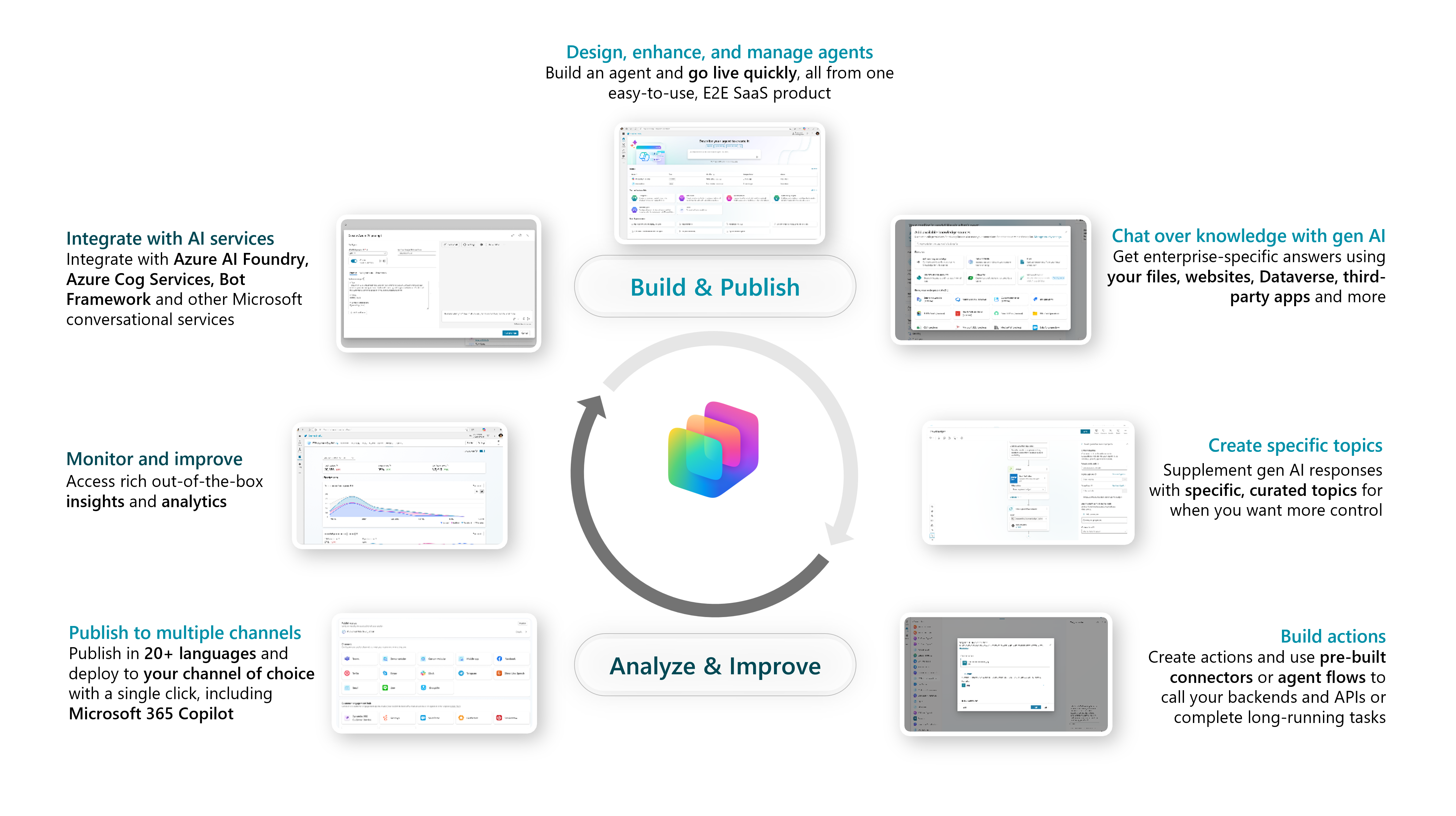 Copilot Studio obsługuje pełny, kompleksowy cykl życia przeznaczony do projektowania, ulepszania i zarządzania agentami z jednego ujednoliconego środowiska Software as a Service (SaaS).