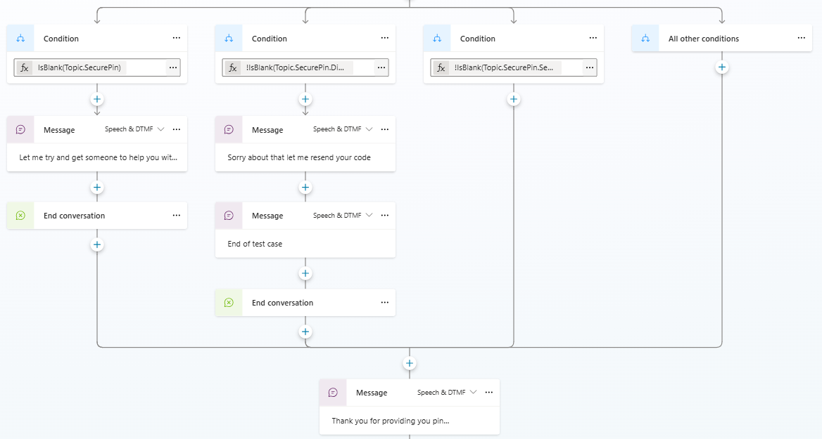 Po węźle Pytanie możesz mieć gałąź węzłów Warunek do obsługi odmian. Na przykład, jeśli osoba dzwoniąca nie uzyska potrzebnych informacji, istnieją ścieżki konwersacyjne, które można podjąć w takiej sytuacji.