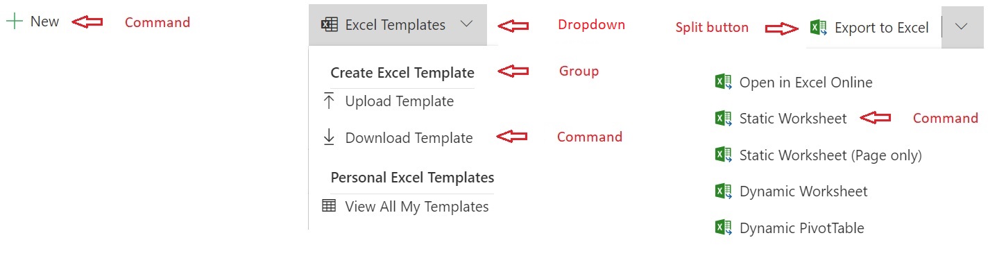 - Polecenie. Przycisk standardowy. Wykonanie akcji po wybraniu tej opcji. Może być również zagnieżdżone w grupach z menu rozwijanymi i przyciskami podziału. Były to tzw. menu wysuwane w klasycznym poleceniach.