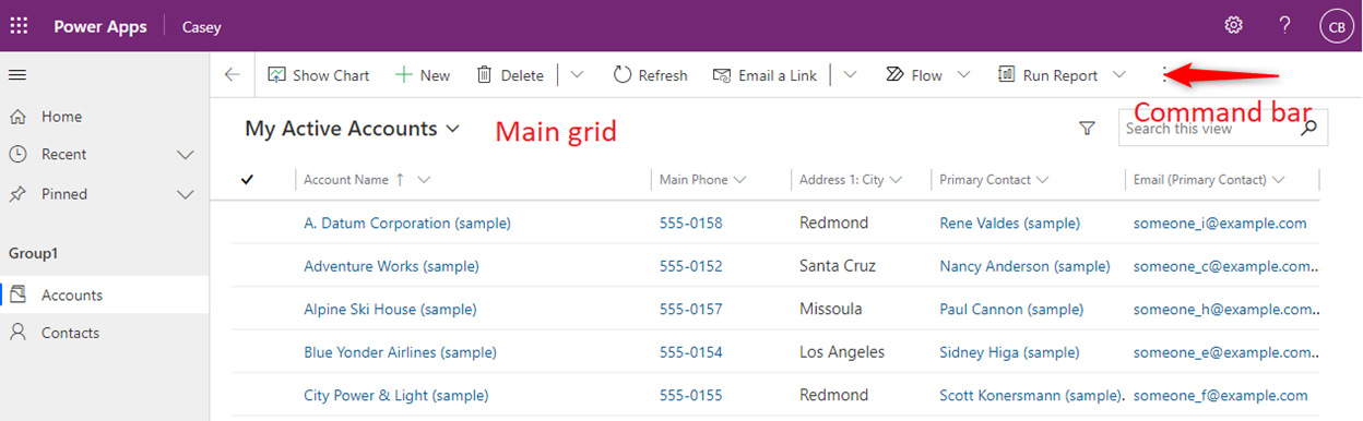 Siatka główna. Pasek poleceń jest wyświetlany podczas używania nawigacji po lewej stronie aplikacji w celu wyświetlenia pełnej listy stron rekordów w tej tabeli.