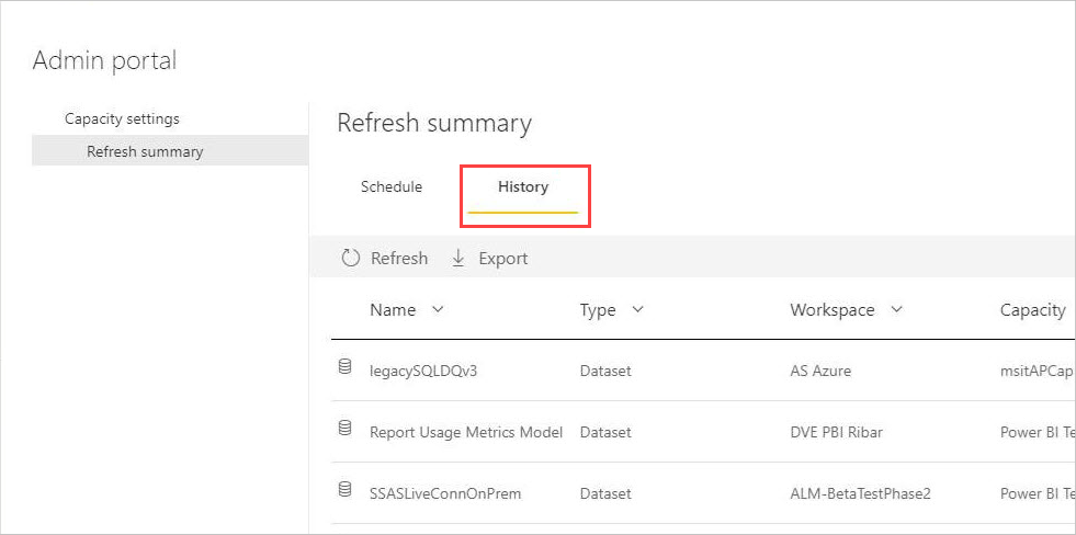- Historia. Wyświetla historię podsumowania odświeżeń dla pojemności usługi Power BI Premium, których jesteś administratorem.