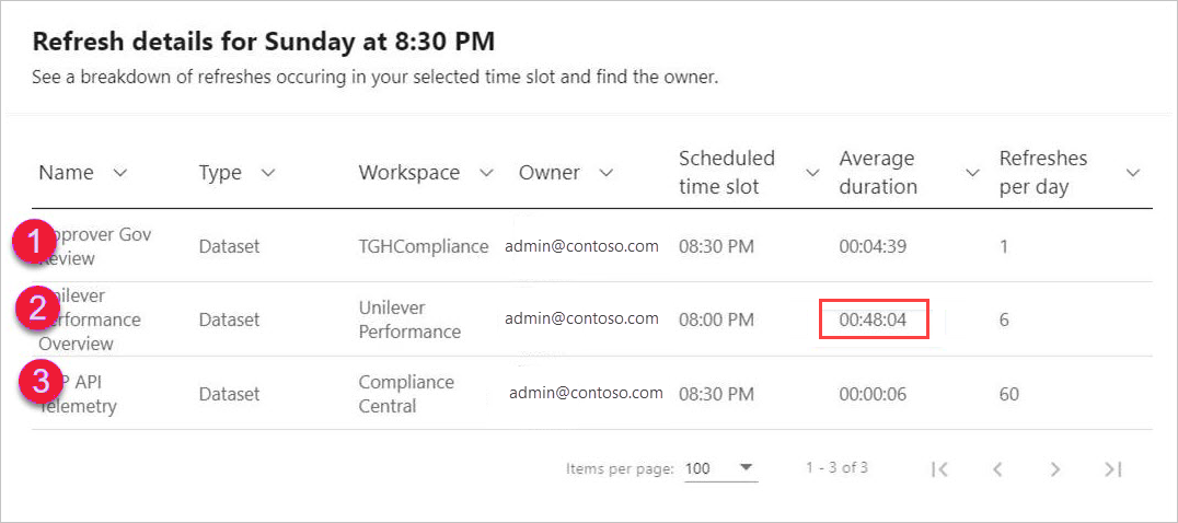 Kolumna Czas odświeżania (w minutach) jest wyliczeniem średniej z maksymalnie 60 rekordów dla każdego skojarzonego modelu semantycznego. Wartość liczbowa dla każdego 30-minutowego przedziału czasu to suma minut obliczona dla wszystkich zaplanowanych odświeżeń zaplanowanych do uruchomienia w przedziale czasu oraz wszystkich zaplanowanych odświeżeń, które miały rozpocząć się w poprzednim przedziale czasu , ale których średni czas trwania przeciąga się na wybrany przedział czasu.