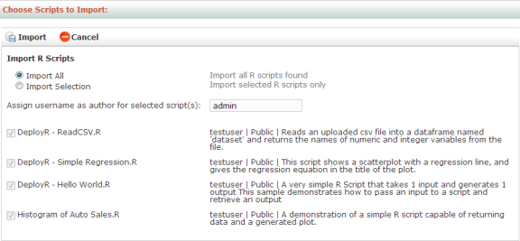 In this tab, you can export shared or published R scripts on this server to a CSV file as a way to backup scripts or as the first step in migrating R script data between two or more DeployR-server instances. You can also import R scripts into the repository on this server instance from a previously exported R script CSV file.