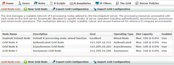 Each node on the grid contributes its own processor, memory, and disk resources. These resources can be leveraged by the DeployR server to run R code as part of user authenticated, asynchronous, and anonymous operations.