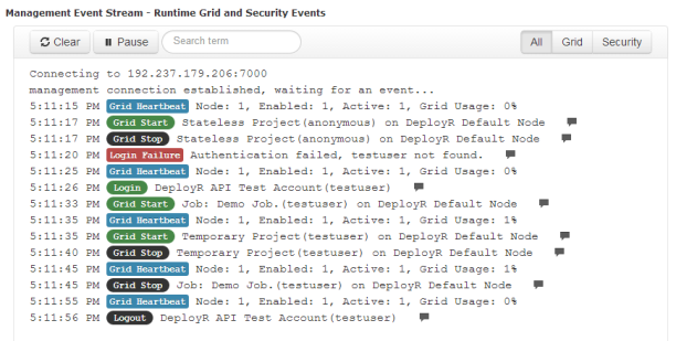 When you are logged in as admin, you can monitor the runtime grid and security events on the management event stream from the Home page. The management event stream allows you to see runtime grid activity events, grid warning events, and security access events. By default this stream is accessible to admin only; however, access can be changed in the Server Policies tab.