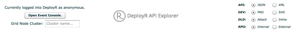 http://<DEPLOYR-SERVER-IP-ADDRESS-AND-PORT>/deployr/landing/. From there, you can launch the API Explorer in your Web browser by clicking the API Explorer link near the top of the page.Or, access the API Explorer directly here: