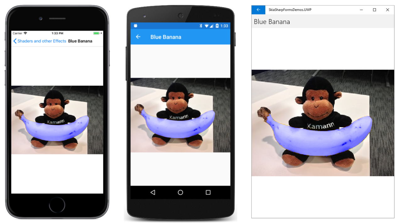 Program PaintSurface obsługi rysuje mapę bitową z małpą trzymającą banan. Ten kod jest wyświetlany za pomocą blueBananaBitmap SKBlendMode.Colorpolecenia . Na powierzchni bananu każdy piksel Hue i Nasycenie jest zastępowany przez niebieski lity, który odpowiada wartości odcienia 240 i wartości nasycenia 100. Jasność pozostaje jednak taka sama, co oznacza, że banan nadal ma realistyczną teksturę pomimo nowego koloru: