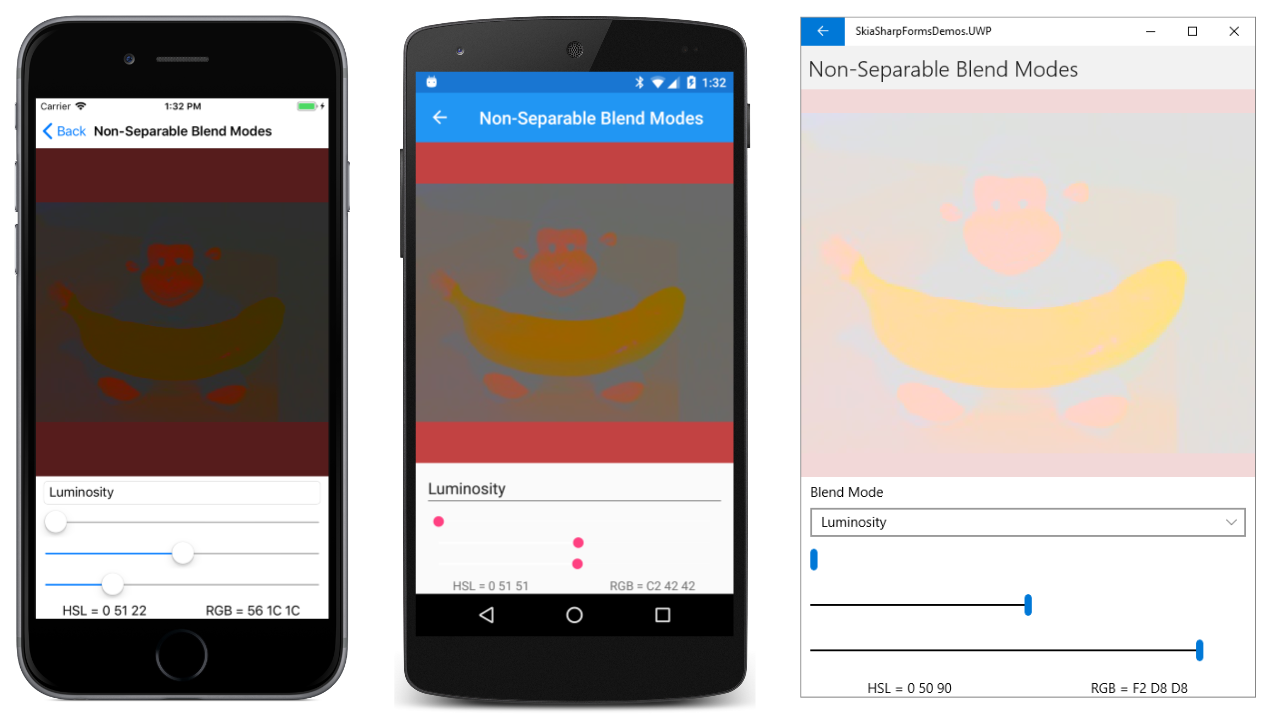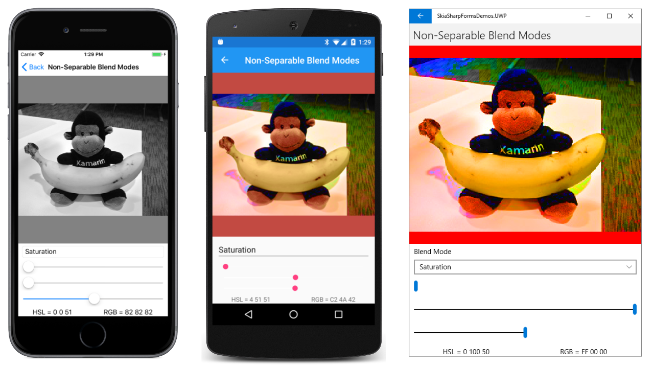 Jak pokazano w artykule SkiaSharp separable blend tryby, separable blend tryby wykonują operacje na czerwonych, zielonych i niebieskich kanałach oddzielnie. Tryby nieparzystnego mieszania nie są. Korzystając z poziomów kolorów Hue, Nasycenie i Jasność, tryby mieszania nieudzielnego mogą zmieniać kolory w ciekawy sposób: