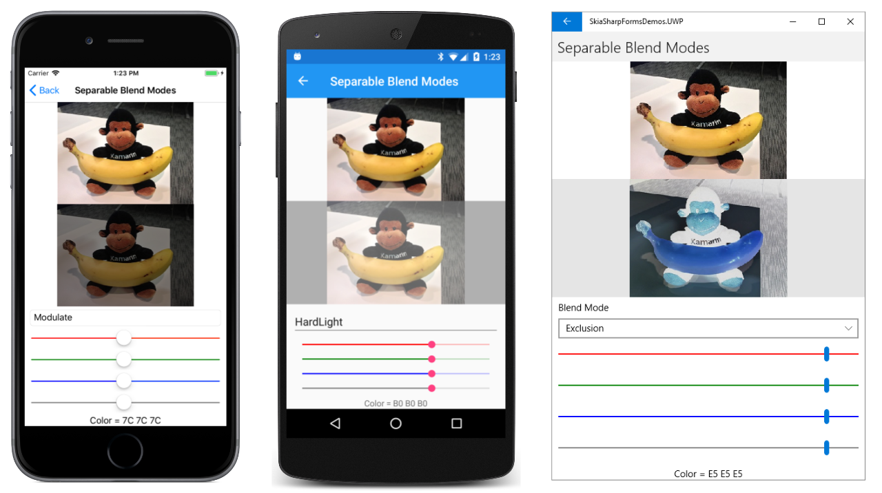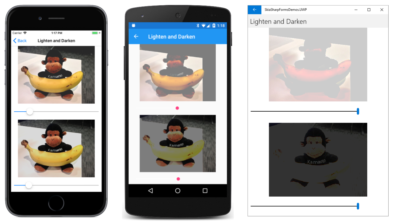 Te dwa tryby są pokazane na stronie Lighten i Darken . Plik XAML tworzy wystąpienie dwóch SKCanvasView obiektów i dwóch Slider widoków:
