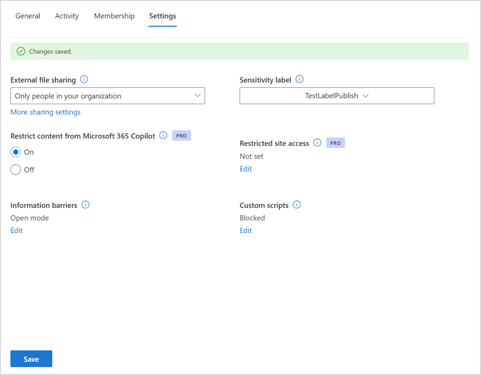 Once the policy is enabled on the site, the Restricted tag will be visible on the Home tab of the site as shown below: