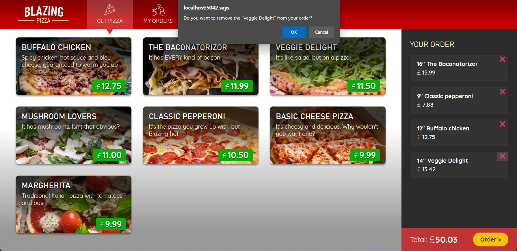 Z kilkoma pizzami w zamówieniu wybierz znak X obok jednej z pizz. Zostanie wyświetlone standardowe okno dialogowe potwierdzenia języka JavaScript.