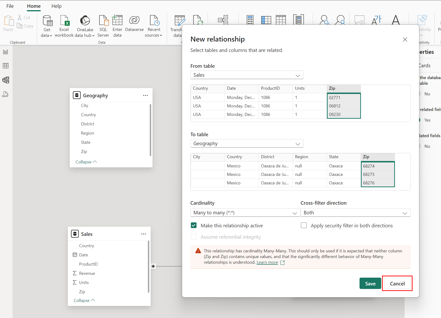 To ostrzeżenie jest wyświetlane, ponieważ w tabeli Geografia nie ma unikatowych wartości Zip. Wiele krajów może mieć ten sam kod pocztowy, co powoduje wyświetlenie ostrzeżenia. Połączmy kolumny Zip i Country, aby utworzyć unikatowe pole wartości w celu rozwiązania problemu.