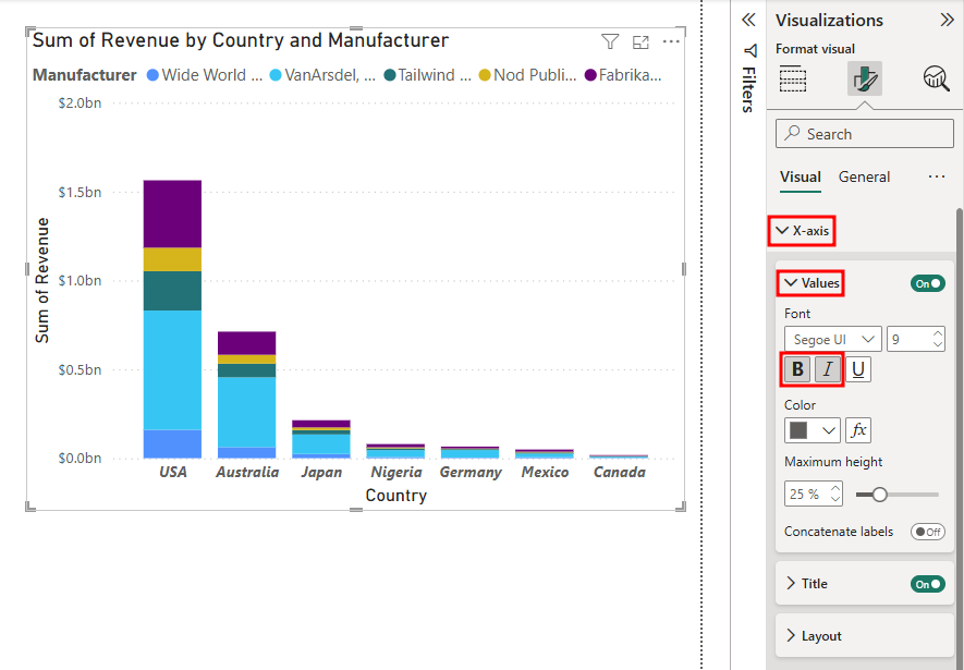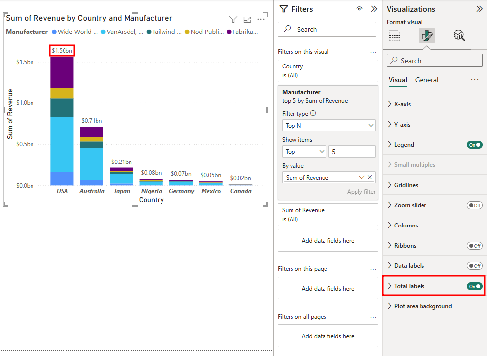 Jeśli chcesz, możesz teraz zwinąć okienko Filtry , dopóki nie będzie ponownie potrzebne. Teraz dodaj etykiety sumy do skumulowanych wizualizacji. Zaczynasz od opcji formatowania czcionek.