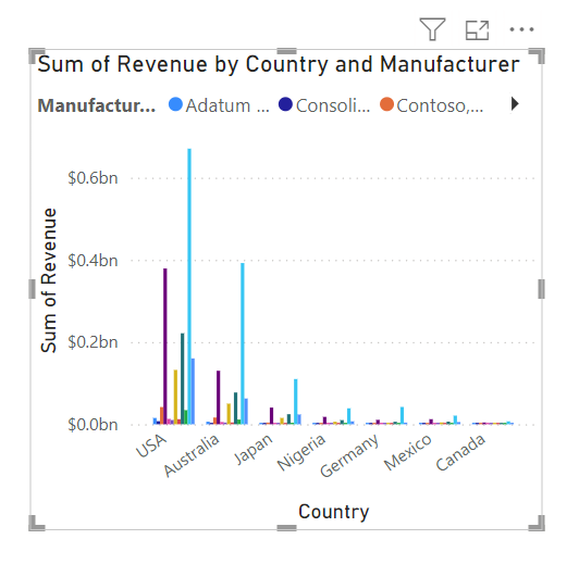 Utworzony wcześniej wykres kolumnowy grupowany pokazuje inną sprzedaż dla każdego kraju lub regionu. Największą sprzedaż mają Stany Zjednoczone, następnie Australia, a następnie Japonia.