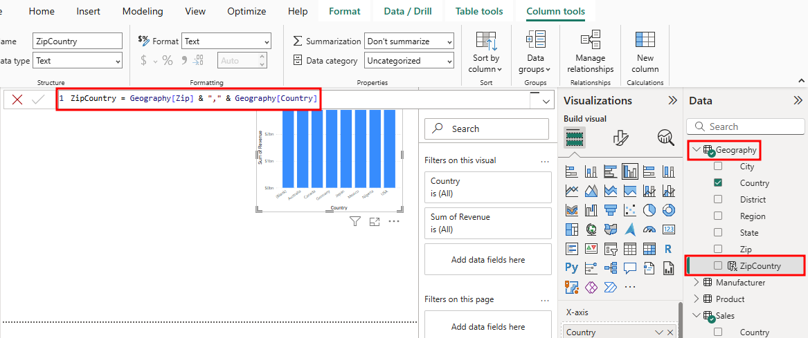 ZipCountry = Geography[Zip] & "," & Geography[Country]Zobaczysz nową kolumnę, ZipCountry, w tabeli Geography (Geografia ). Ostatnim krokiem jest skonfigurowanie relacji między dwiema tabelami przy użyciu nowo utworzonych kolumn ZipCountry w każdej z tych tabel.