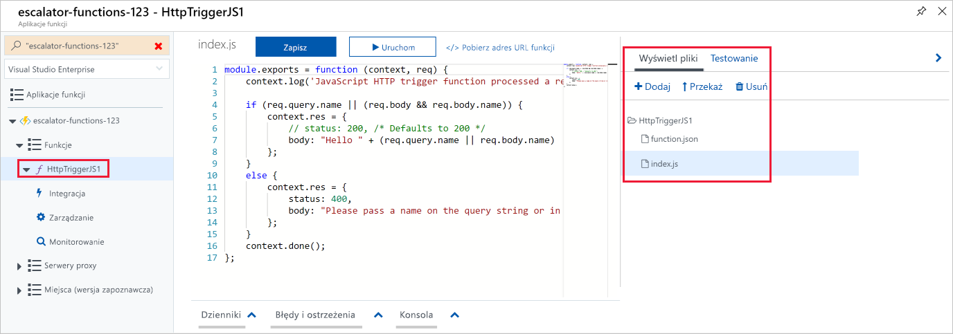 Po utworzeniu funkcji w portalu należy ją przetestować. Istnieją dwa podejścia: