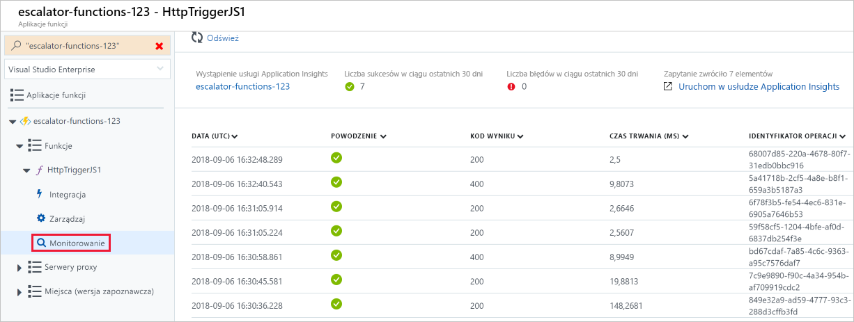 Możliwość monitorowania funkcji ma zasadnicze znaczenie podczas opracowywania i w środowisku produkcyjnym. Witryna Azure Portal udostępnia pulpit nawigacyjny monitorowania, który można włączyć, włączając integrację usługi Application Insights. W menu Funkcja App w obszarze Ustawienia wybierz Application Insights, wybierz Włącz Application Insights, a następnie wybierz pozycję Zastosuj. W oknie dialogowym wybierz pozycję Tak. Pulpit nawigacyjny usługi Application Insights umożliwia szybkie wyświetlanie historii operacji funkcji przez wyświetlenie znacznika czasu, kodu wyniku, czasu trwania i identyfikatora operacji wypełnionego przez usługę Application Insights.