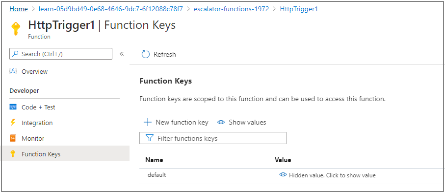 Domyślnie wartość klucza funkcji jest ukryta. Pokaż domyślną wartość klucza funkcji, wybierając pozycję Pokaż wartość. Skopiuj zawartość pola Wartość do schowka, a następnie zapisz ten klucz w Notatniku lub podobnej aplikacji do późniejszego użycia.