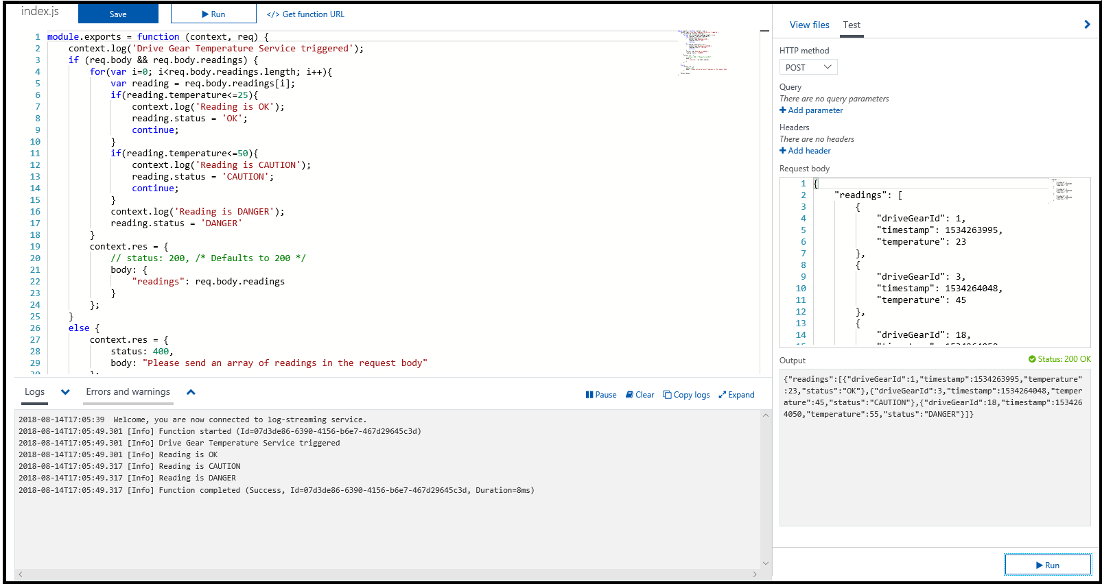 Logika, którą dodaliśmy, jest bardzo prosta. Iterujemy przez tablicę i ustawiamy stan JAKO OK, PRZESTROGA lub NIEBEZPIECZEŃSTWO na podstawie wartości pola temperatury. Następnie wysyłamy z powrotem tablicę odczytów z polem stanu dodanym do każdego wpisu.