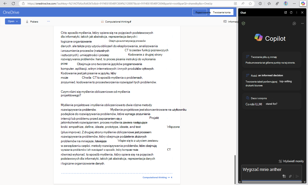 Otwórz plik PDF myślenia obliczeniowego w przeglądarce Microsoft Edge, a następnie otwórz Copilot Chat, wybierając ikonę Copilot Chat na pasku narzędzi przeglądarki Edge. Copilot Chat otwiera się jako aplikacja na pasku bocznym krawędzi.
