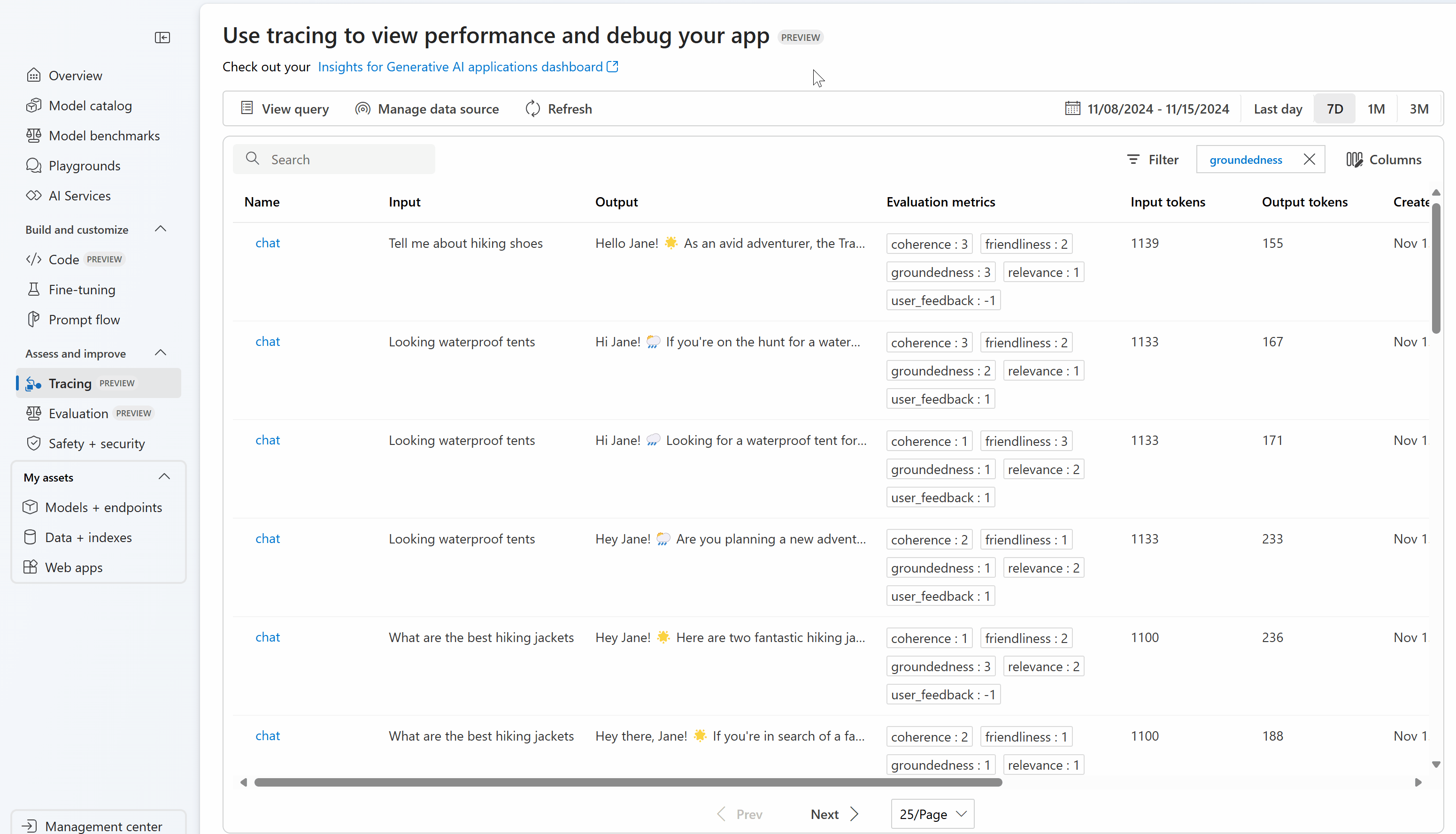 Po połączeniu wystąpienia usługi Application Insights z projektem Microsoft Foundry ważne metryki są już widoczne na pulpicie nawigacyjnym Insights dla aplikacji wykorzystujących generatywną sztuczną inteligencję.