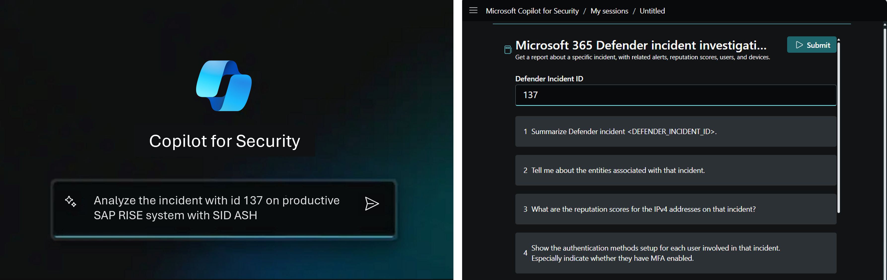 Copilot zabezpieczeń może być używany z dowolnym źródłem danych, które obsługuje Defender XDR i Microsoft Sentinel, w tym z systemem SAP RISE/ECS. Poniżej przedstawiono samodzielne doświadczenie.