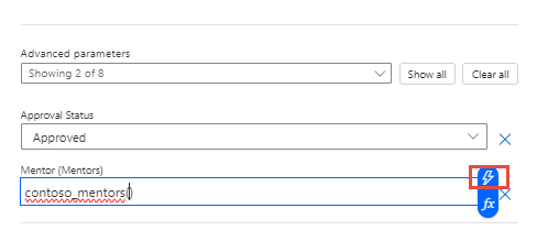 Select Mentor. Input contoso_mentors() and select inside the parentheses, then select the dynamic content icon.