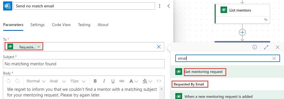 Select the Requested By Email value of the Get mentoring request step from the Dynamic content pane.