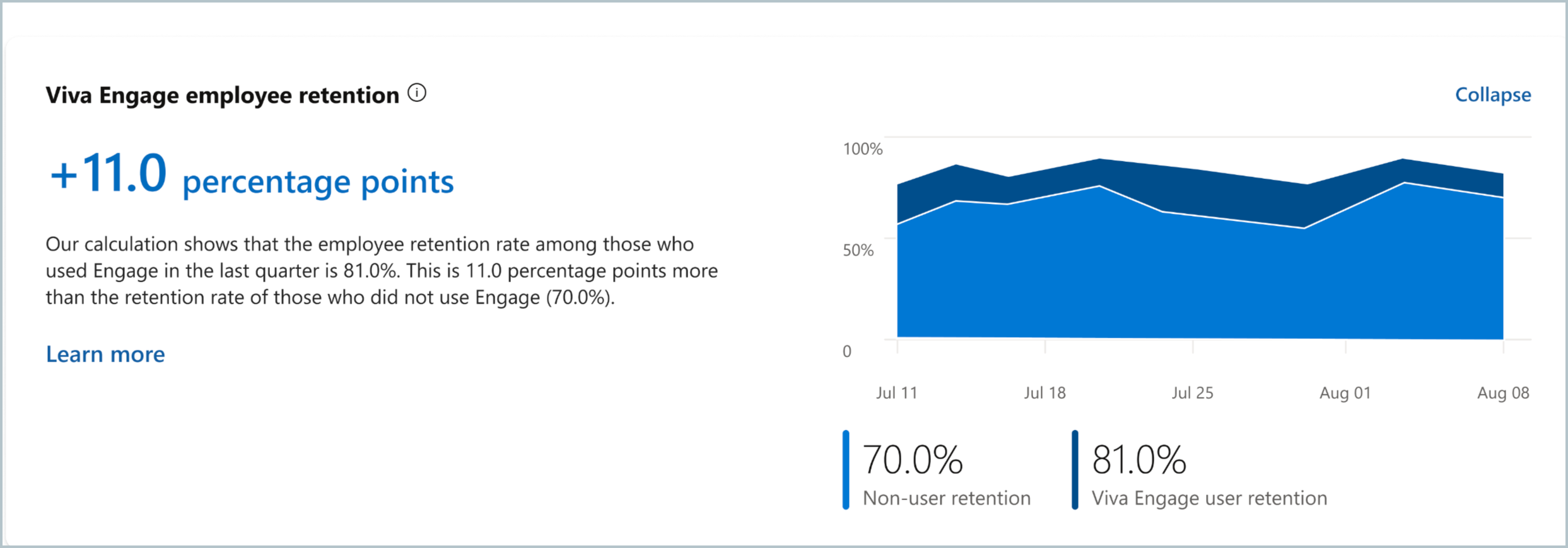The Network Analytics dashboard shows a Viva Engage employee retention metric. This metric shows the difference in 28-day retention rates between employees who use Viva Engage and employees who don't. Since Viva Engage doesn't have access to customer human resources data, it uses a retention metric to note an employee's active Microsoft 365 account. Find more detail about these calculations with a numerical example in the following sections.