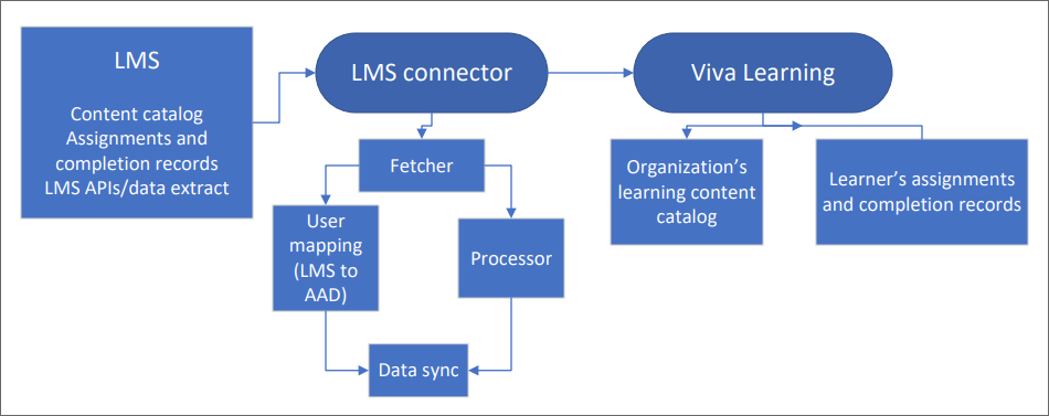 The dataflow diagram illustrates how Viva Learning uses the LMS connector to ingest the learning content catalog and learner records (assignments and completion status). The learning management system (LMS) is the ultimate source of content and learner records for their customers. Viva Learning extracts the content and learner records from the LMS by the LMS Connector as depicted in the following diagram.
