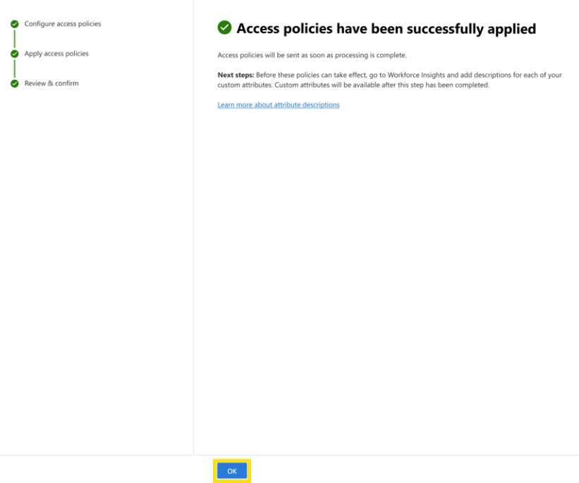 Once saving is complete and access policies have been successfully applied, there's another optional step. Before any custom attributes can go into effect in Workforce Insights, a description must be added for all custom attributes. Select Learn more about attribute descriptions to learn more about what's required for attribute descriptions and access to Workforce Insights.