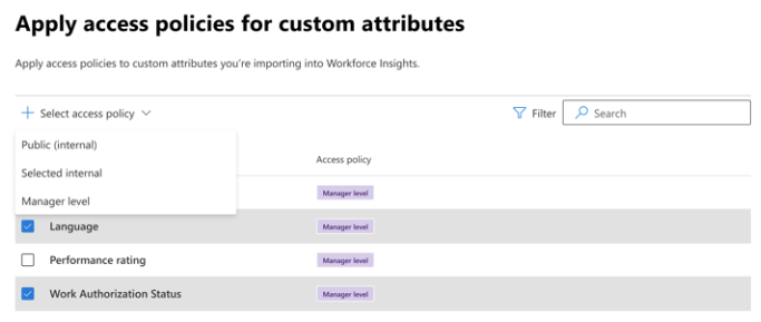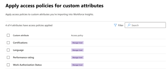 | Workforce Insights | Access policies for public and confidential attributes are pre-set. Access policies for custom attributes can be configured. |