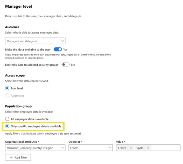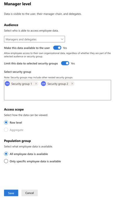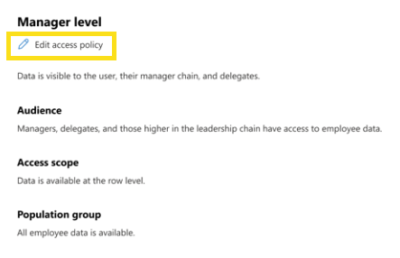 | Limited access | Manager level | Data is visible to the user, their manager chain, and delegates. | Default: Managers and delegates | Row level | Default: All employees |